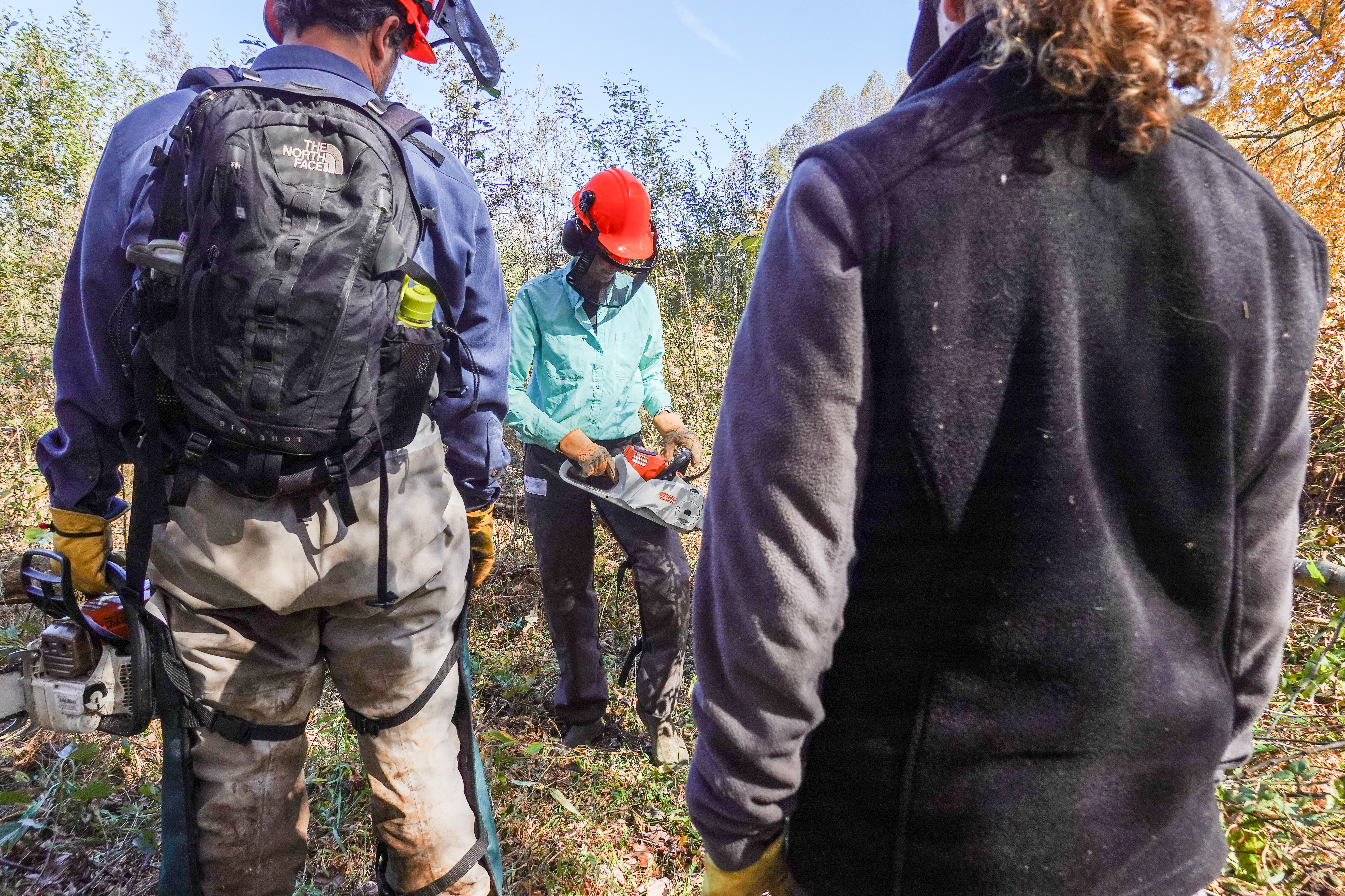 Jay Mays, Sue Cameron, and Madi Polera, US Fish and Wildlife Service, before managing invasive trees at a Henderson County, NC wetland.