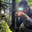 Using a hand lens, with a headlamp providing extra lighting, Sue Cameron examines a tiny spider to see if it is a spruce-fir moss spider.