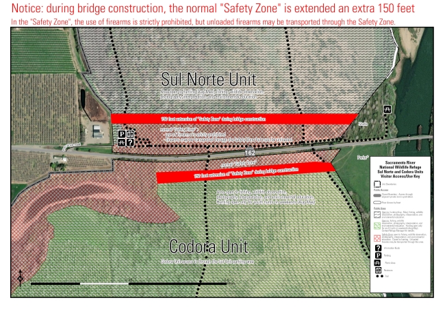aerial image of the temporary 2022 expanded hunting safety zone at the Sul Norte Unit of the Sacramento River National Wildlife Refuge. Normal safety zone depicted as red crosshatch, and expanded safety zone during bridge construction is depicted as solid red.