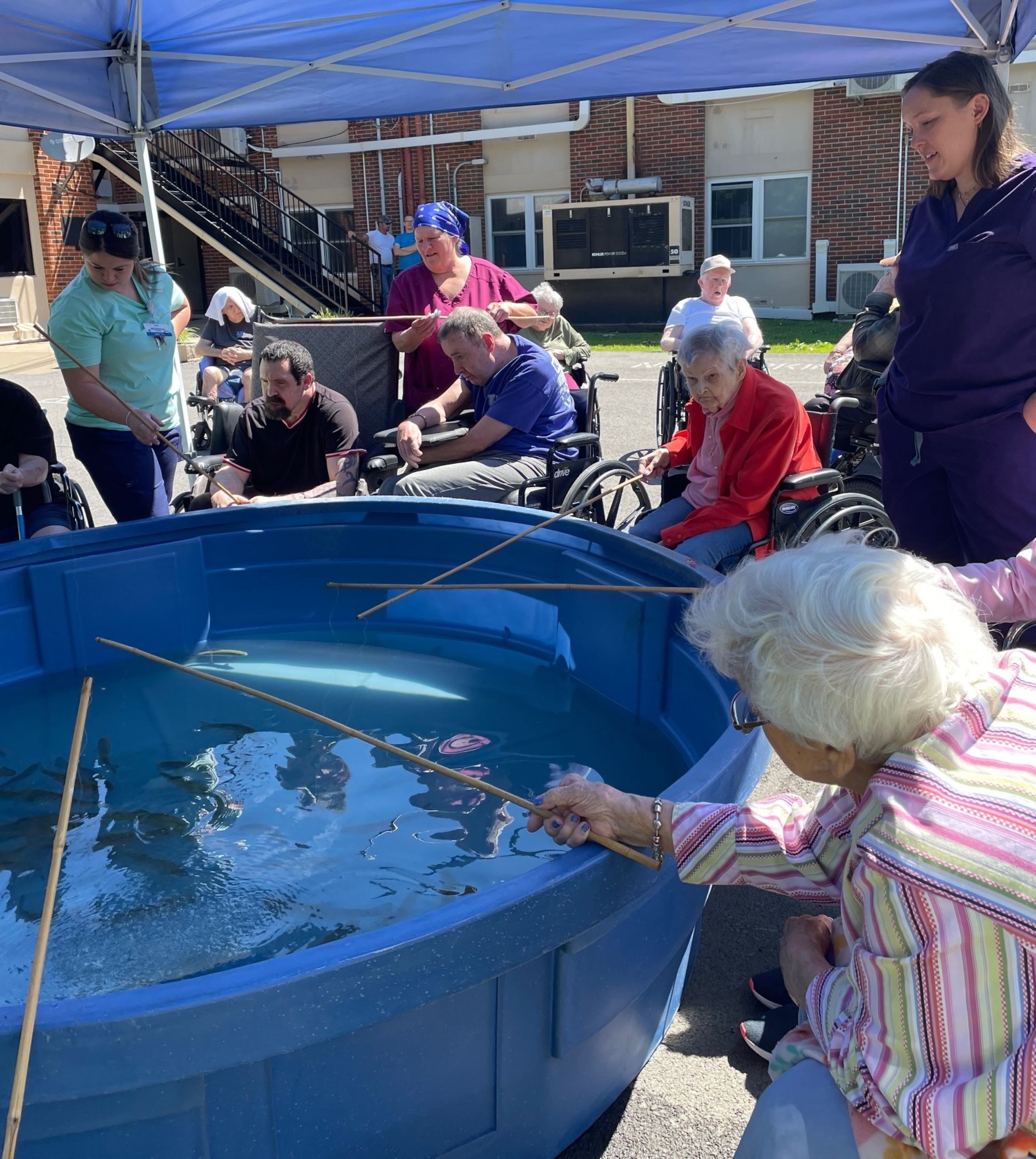 Residents at Summit Manor Rehab & Wellness Center fishing for rainbow trout provided by Wolf Creek National Fish Hatchery.