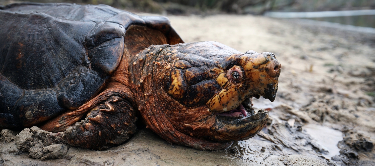 A Suwannee alligator snapping turtle on the sandbank of the Suwannee River.