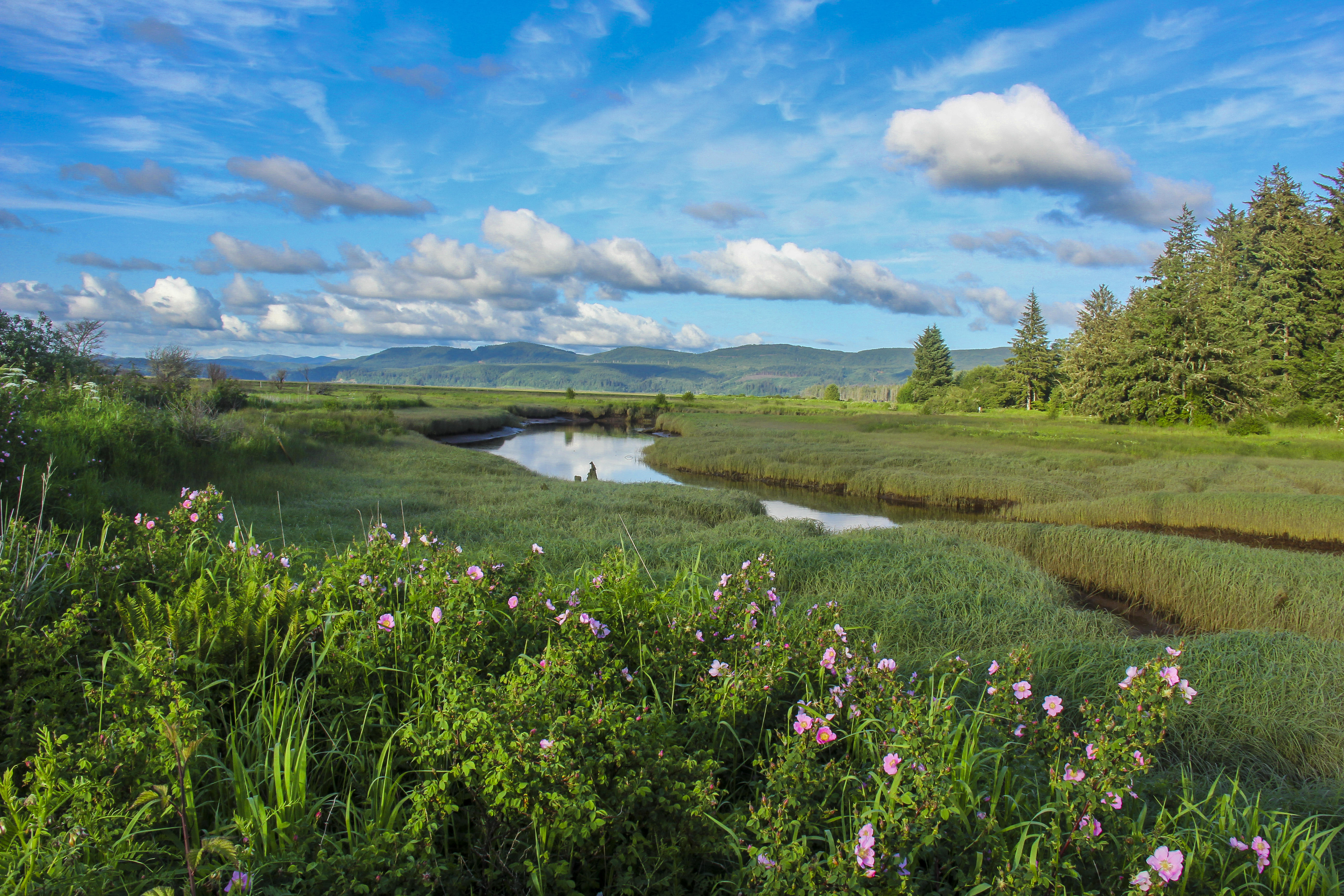 A scenic view of Tarlatt Slough at Willapa National Wildlife Refuge in Washington under a bright blue sky.