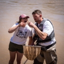 Teacher Patrick Steele and his daughter kissing razorback sucker goodbye.