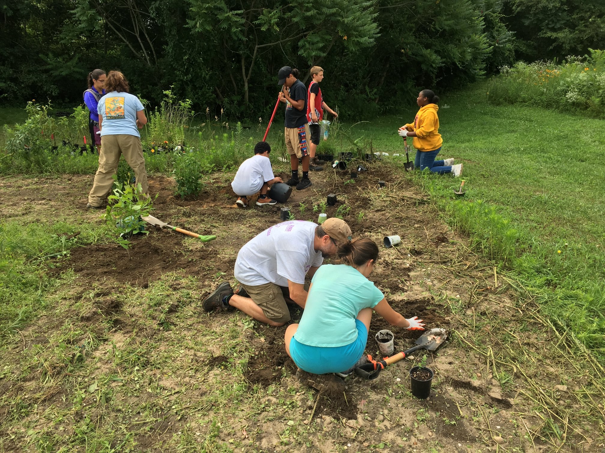 Ted Kendziora and MaryKay Fox lead youth in the planting of native plants during the 2019 POH camp.