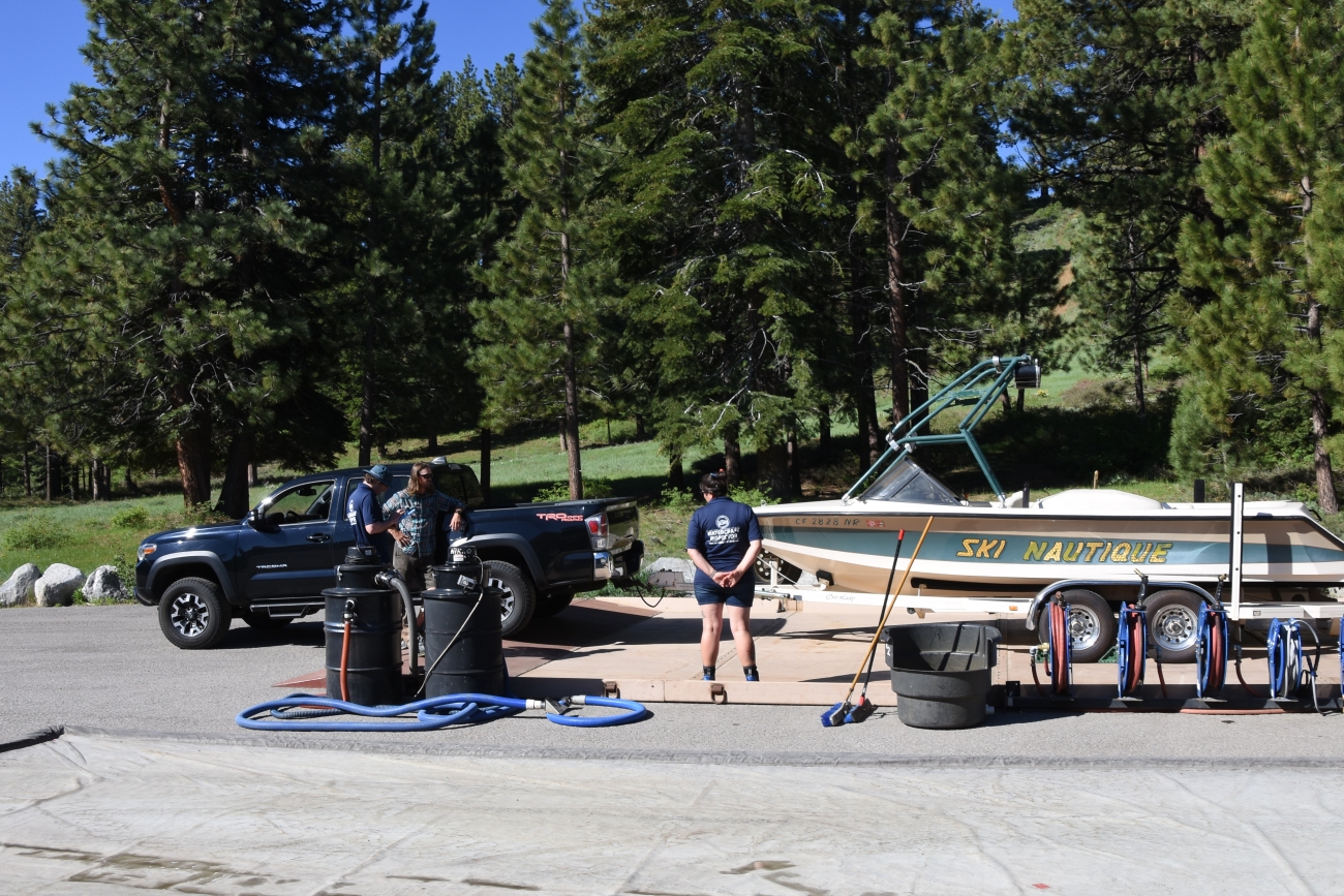 Watercraft inspection station staff members inspect a boat for aquatic invasive species at a temporary, off-ramp station in South Lake Tahoe, Calif. Credit: R. Carlo/USFWS