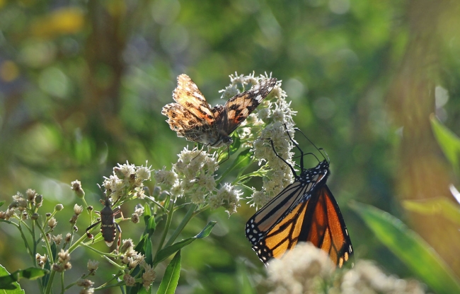 Flowering mule fat trees in Hunter Canyon provide much needed food to local insects and pollinators. Shown here, a Western leaffooted bug (left), a painted lady butterfly (center) and a monarch butterfly share the flowers.