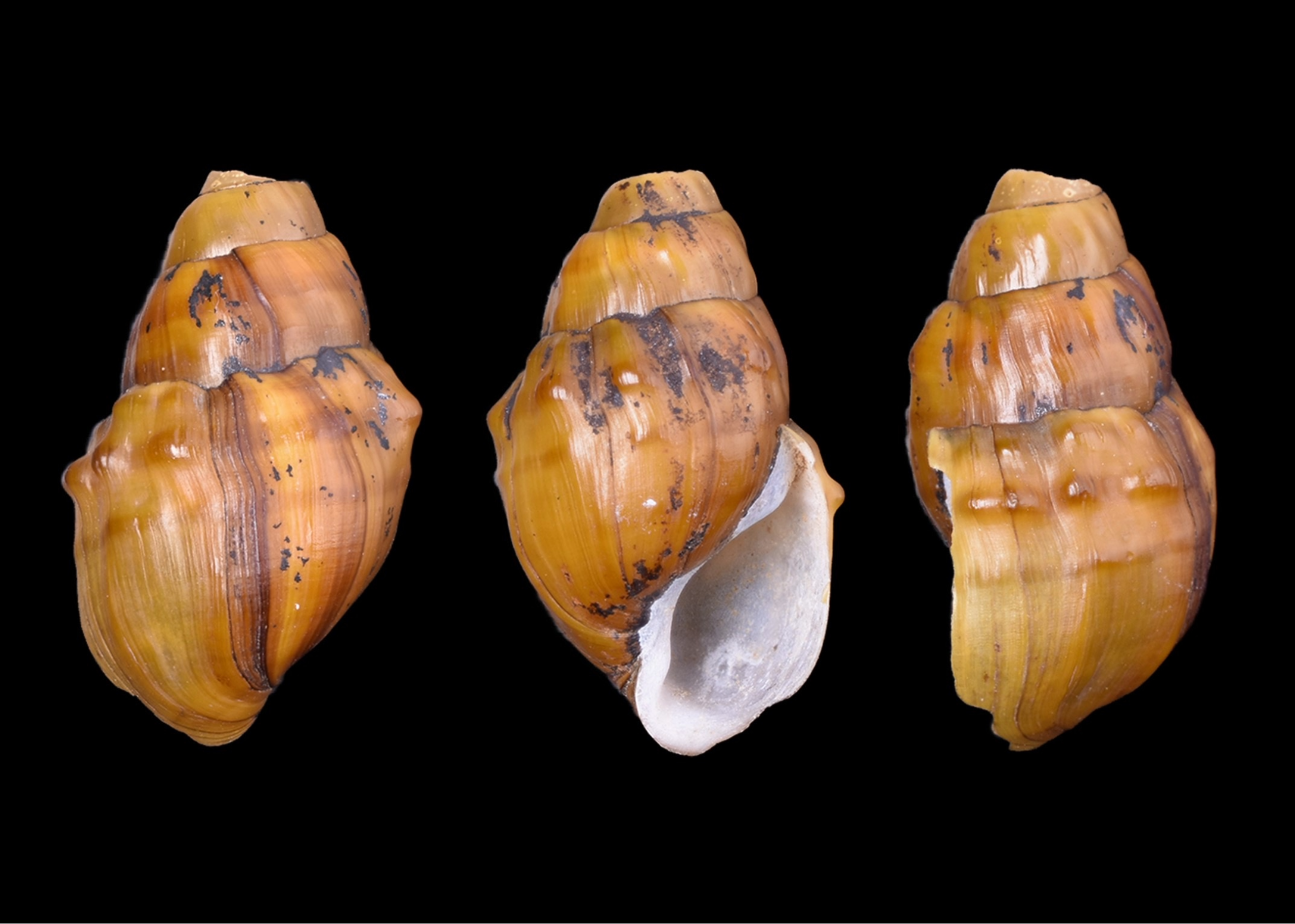 Three shells of the Big Black rocksnails sit over a black background. The Big Black rocksnail is a Mississippi snail thought be extinct, but scientists rediscovered it in 2022.