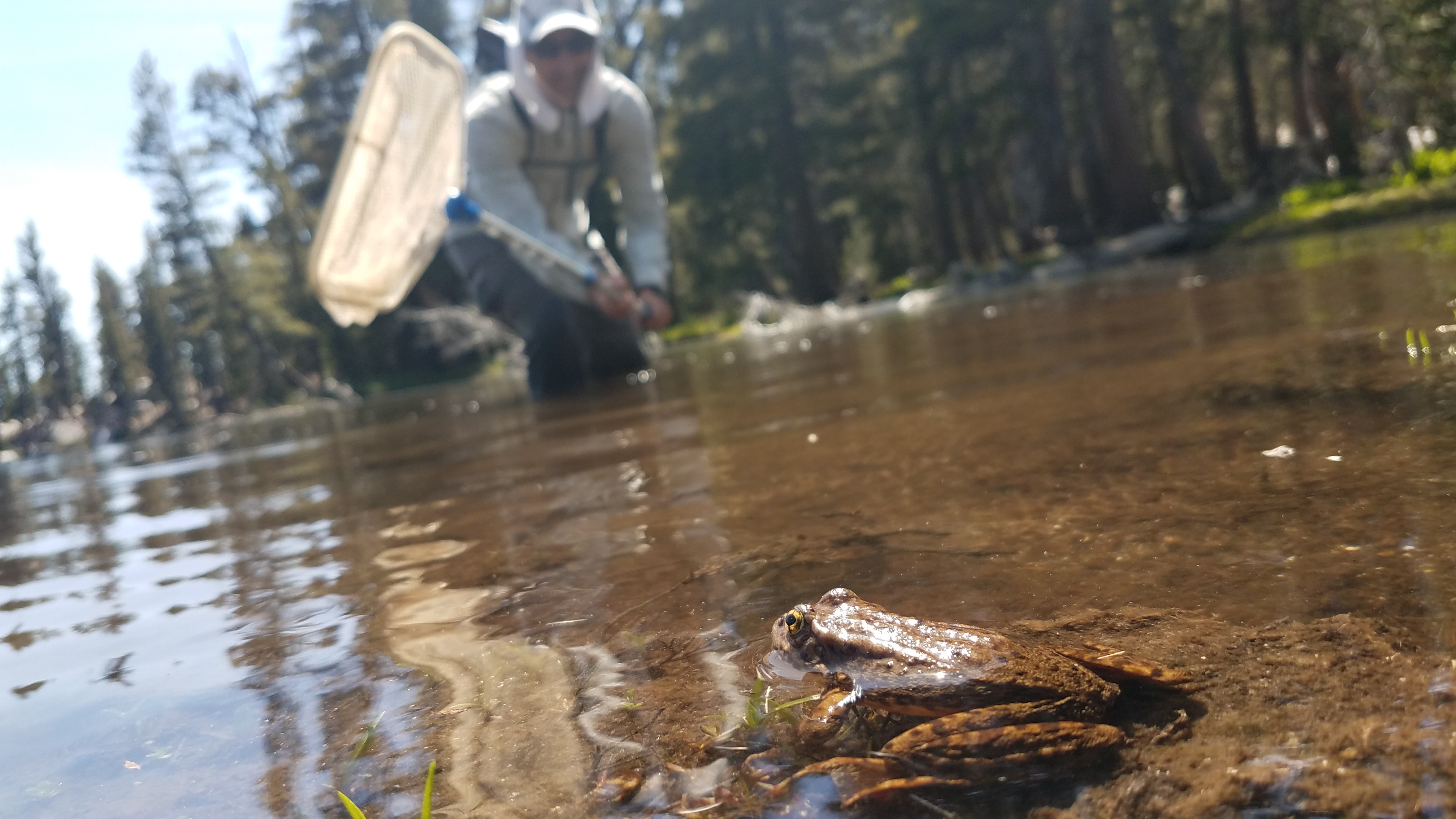Tom Smith captures frogs at a Sierra Nevada lake. Returning to sites where frogs received treatment to perform health checks helps biologists and researchers understand the disease and effectiveness of the treatment.