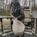 A North Carolina Wildlife Resources Commission Wildlife Enforcement Officer transfers bluegill in a net in order to stock Lake Mattamuskeet. Bluegill are important predators of invasive common carp eggs and larvae, contributing to the Lake Mattamuskeet Aquatic Grass Restoration project.