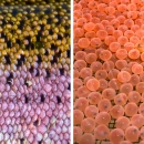 Left: Closeup of rainbow trout scales. Credit: Tom Koerner/USFWS. Right: Winter-run salmon eggs raised at Livingston Stone National Fish Hatchery. Credit: Laura Mahoney/USFWS