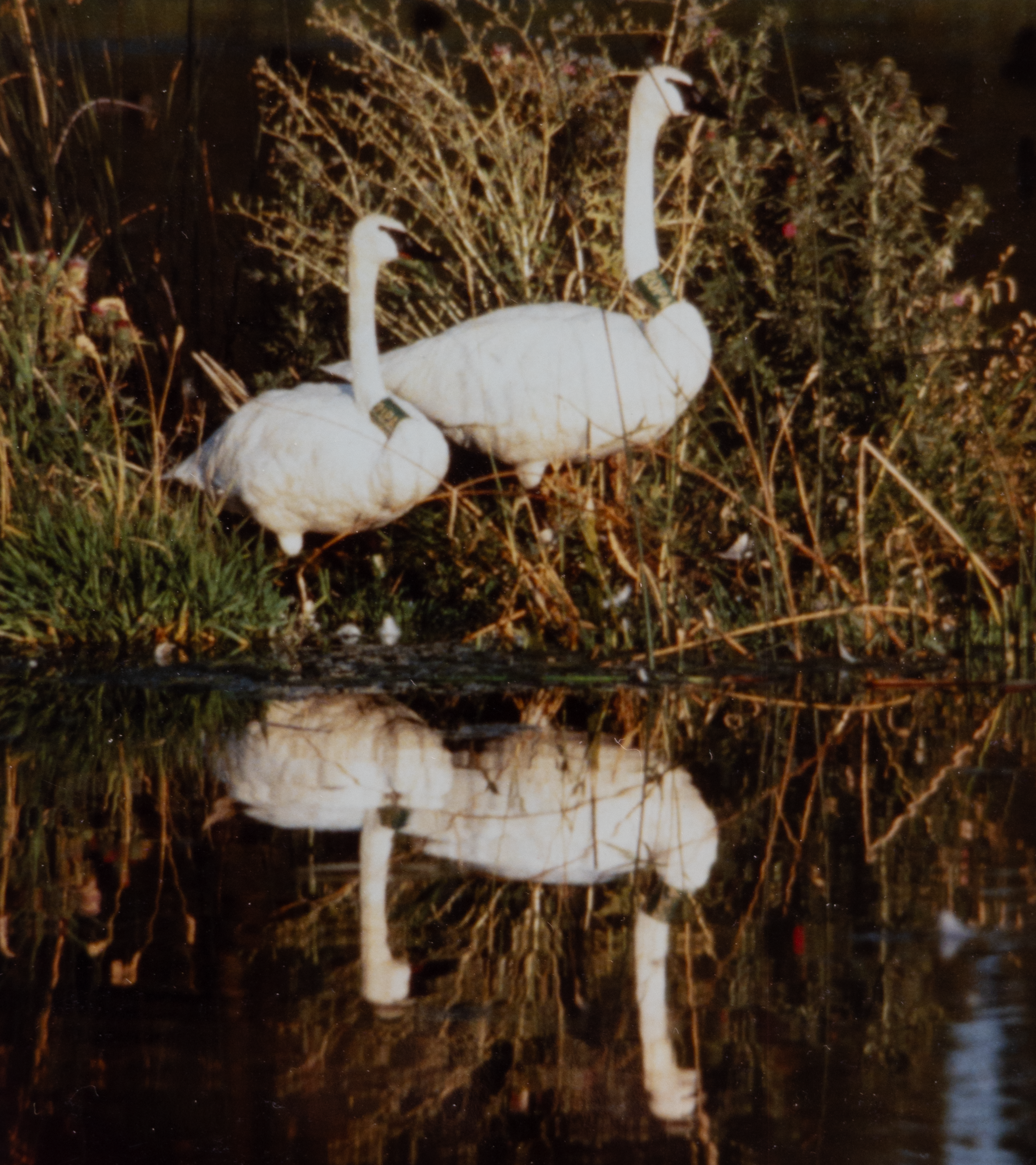 Solo (left) and his pen (right) at their nest sight at Winslow Pool in 1986. The two trumpeter swans were the last remaining breeding pair from a reintroduction project that began in 1963.