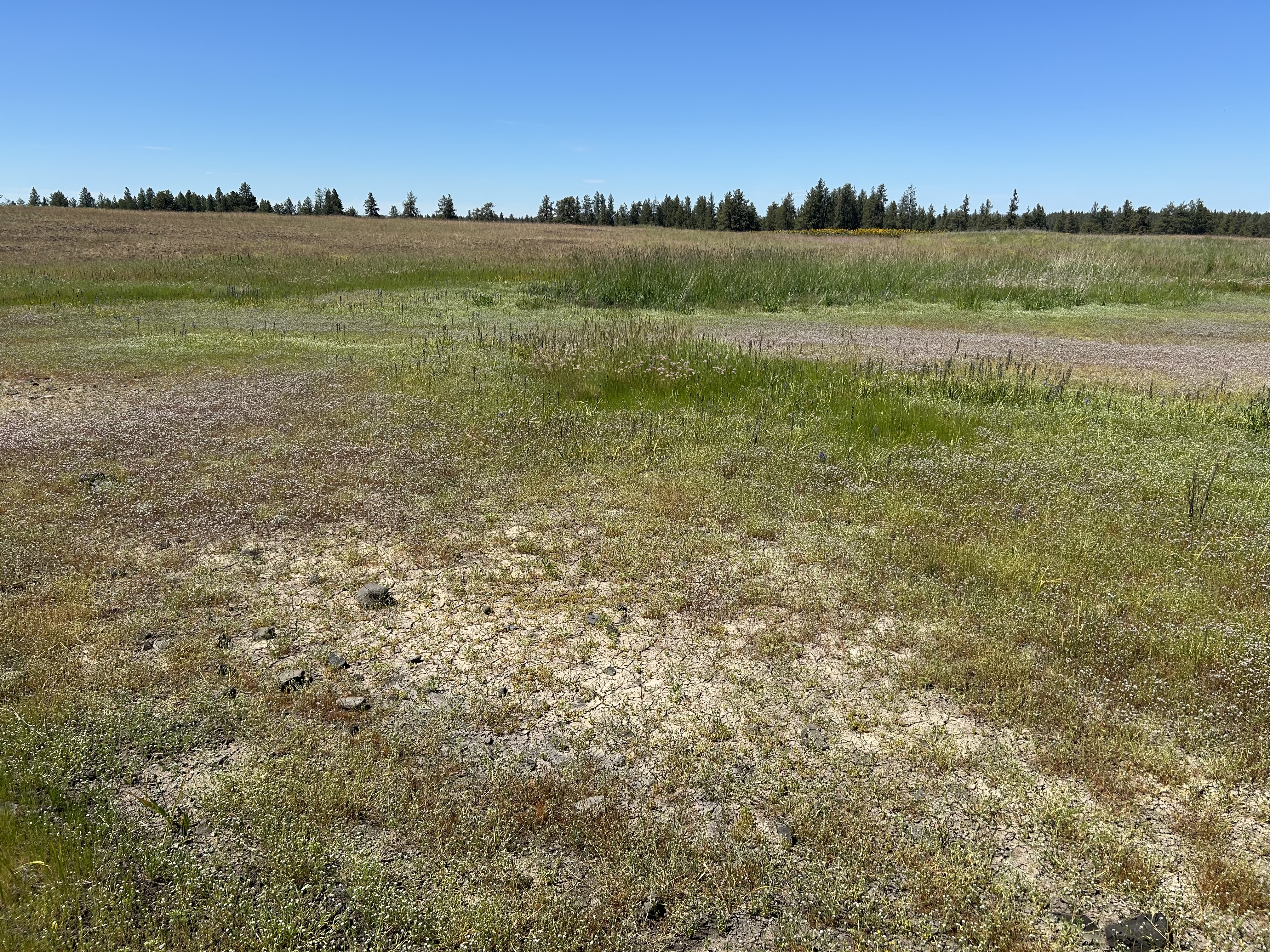 A vernal pool wetland at Turnbull National Wildlife Refuge in late May that is seasonally dry. The lighter, cracked soil has dormant seed shrimp eggs scattered on the surface.