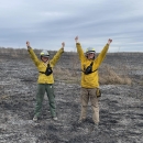 Two wildland firefighters celebrate the completion of a prescribed burn at Patoka River Refuge