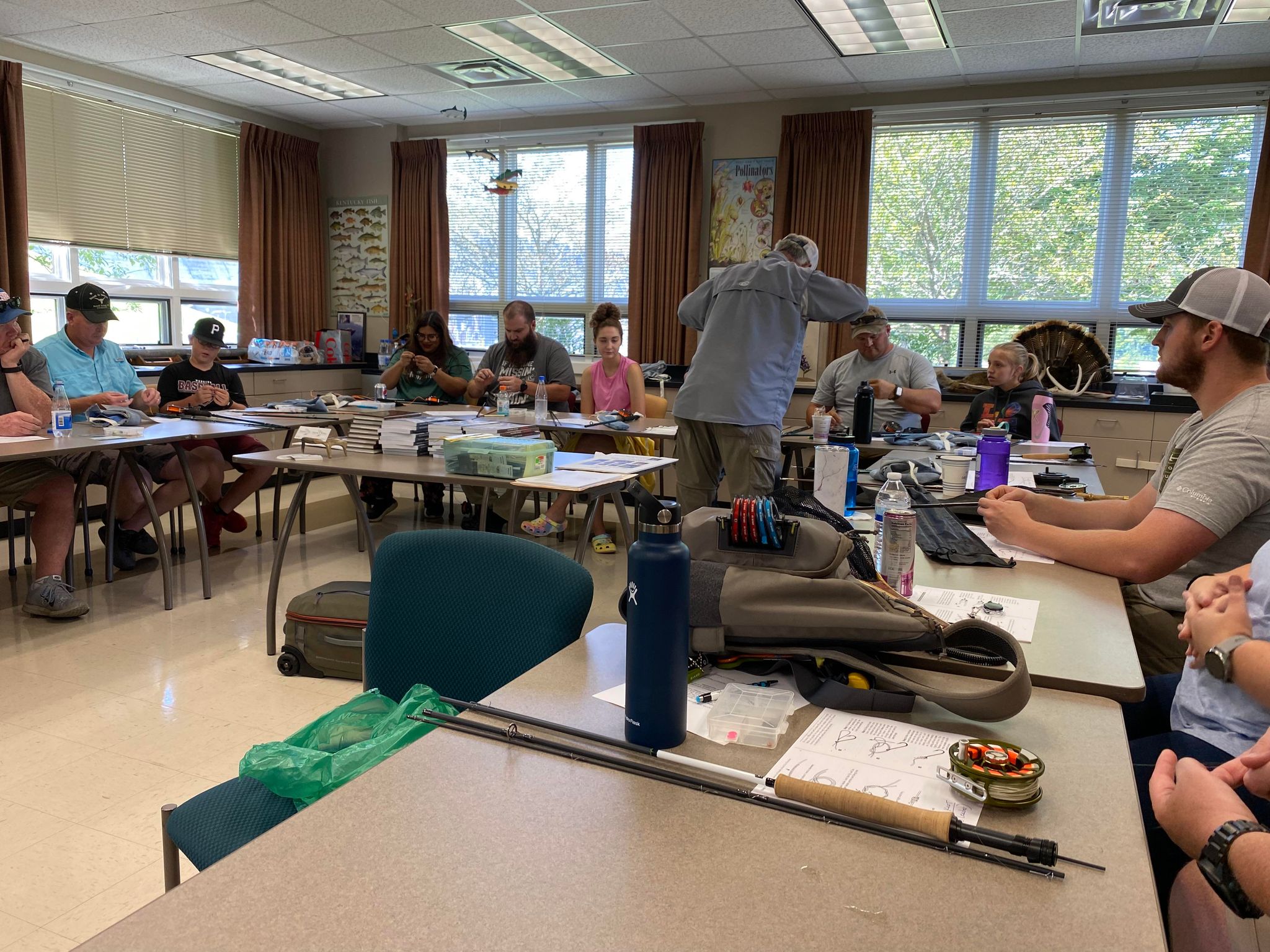 Participants of the Fly Fishing 101 workshop learning to tie different knots.