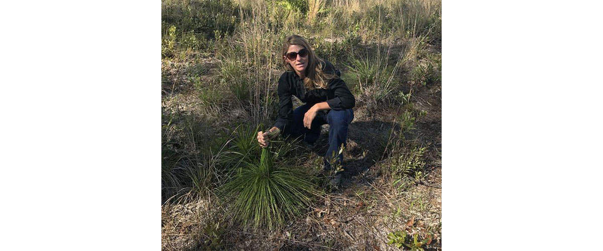 Melanie Kaesor, USFWS ecologist at Tyndall Air Force Base, cradles a young longleaf pine.
