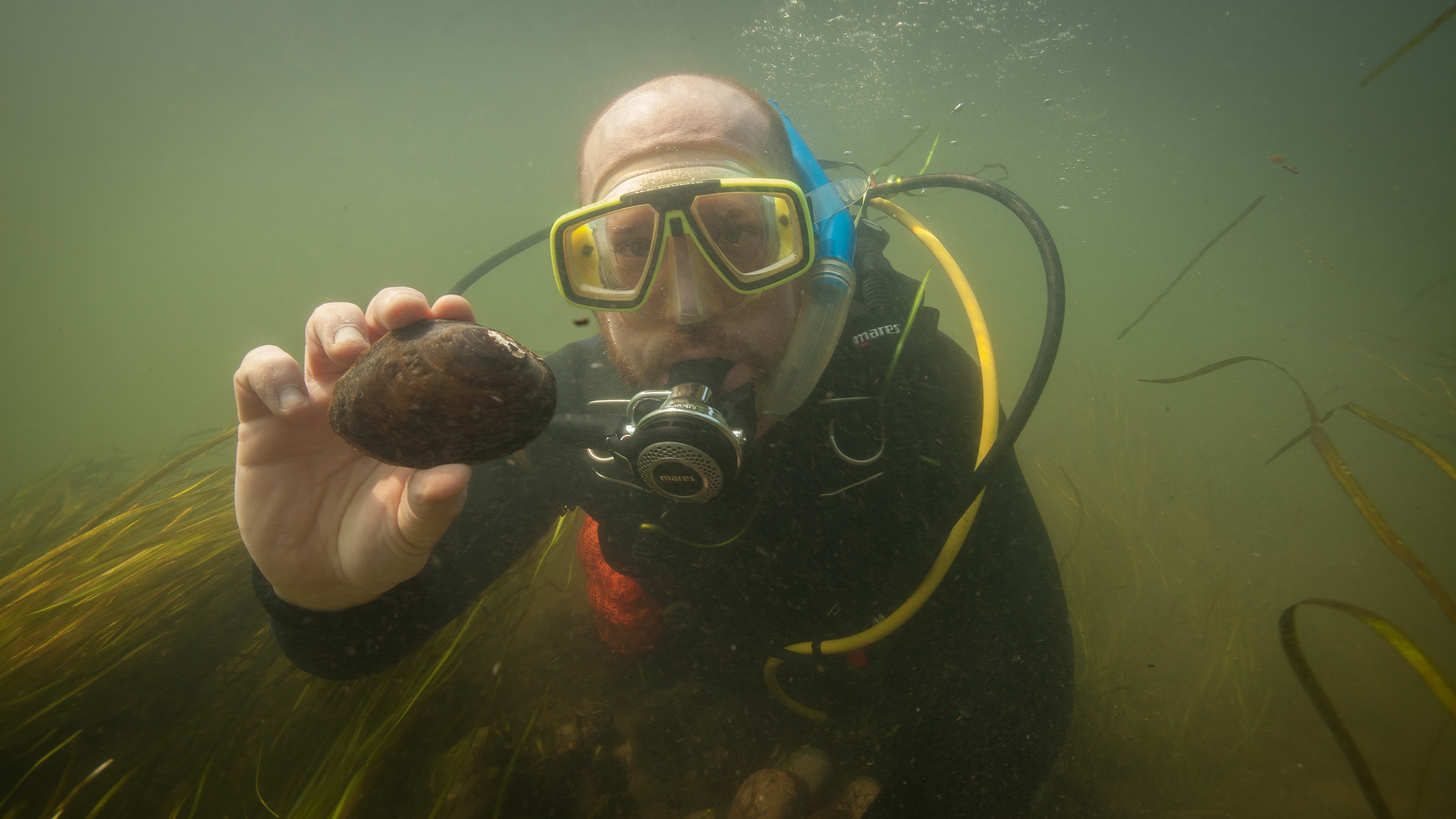 USFWS diver, Matthew Patterson with a freshwater mussel at Hunter Station, Allegheny River. R. Hagerty, USFWS