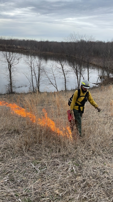 U.S. Fish and Wildlife Service employee and wildland firefighter Audrey Basson uses a drip torch, a handheld device for igniting fires, at Patoka River National Wildlife Refuge in Indiana.