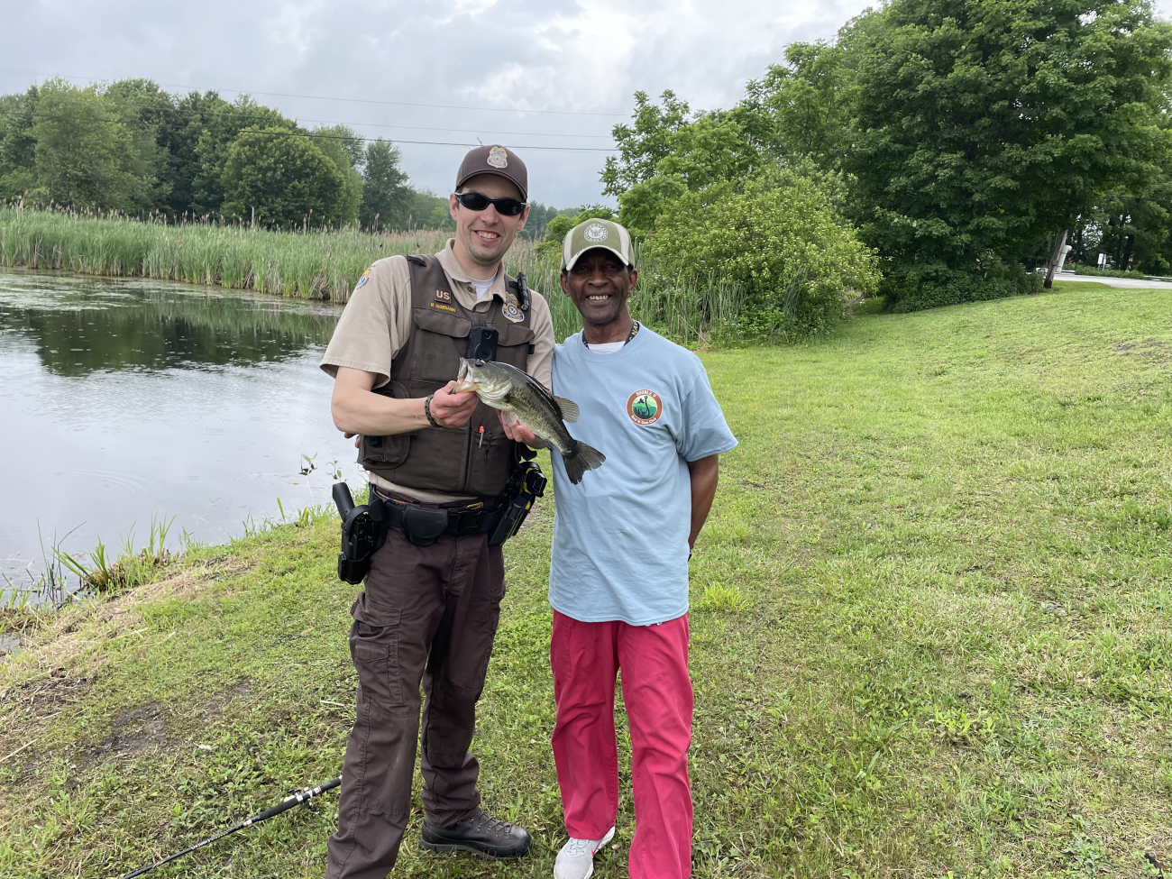 A veteran poses with the bass he caught and Law Enforcement Officer Mike McMenamin at the annual Veterans' Fishing Derby at Wallkill River National Wildlife Refuge