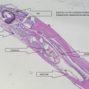 A Chinook salmon juvenile has been processed and stained for histopathology (microscopic examination of tissue in order to study disease).