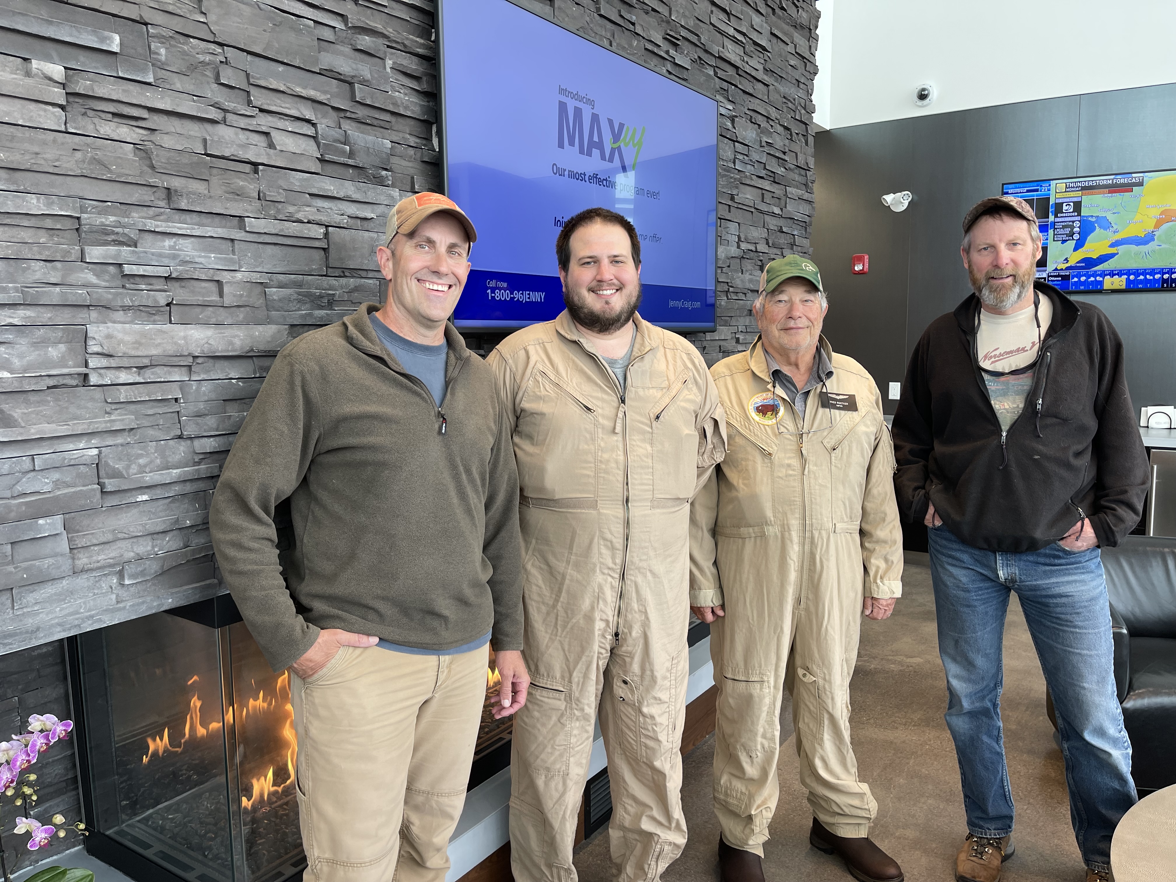 The crew members for the Northern Saskatchewan/Northern Manitoba and Northwest Territories. (Left to right) Wildlife biologist Chris Cain, pilot-biologist Garret Wilkerson, retired pilot-biologist Fred Roetker, and pilot-biologist Walt Rhodes. This picture was taken during the Waterfowl Breeding Population and Habitat Survey.