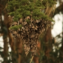 A cluster of overwintering western population monarch butterflies rest on trees in California.