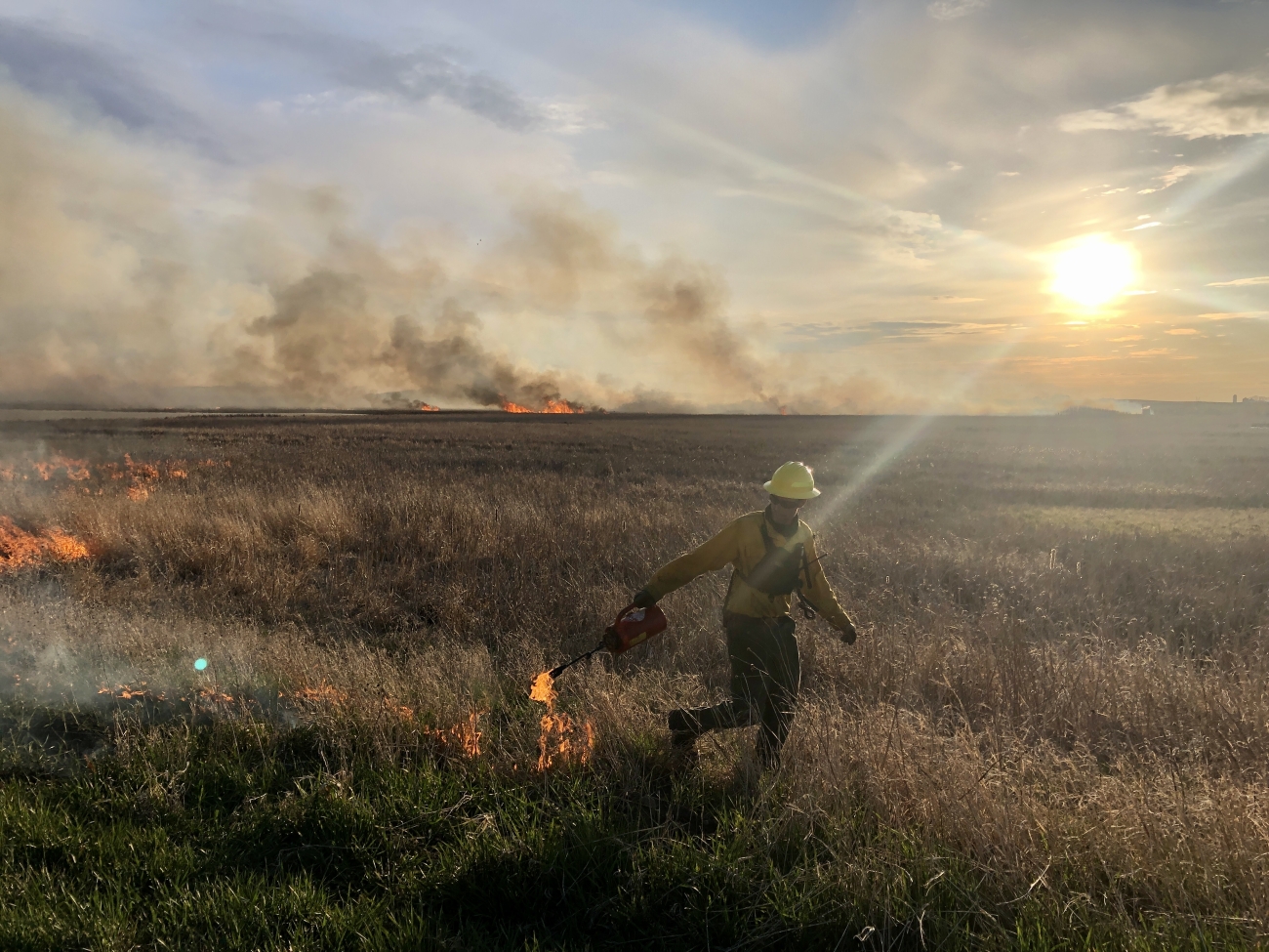 Wildland firefighter applies fire to prairie perimeter to mimic natural fire cycles that improve wildlife habitat at Minnesota Valley National Wildlife Refuge.