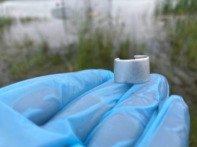 This is an example of an extremely worn bird band that needed replacement. When bands are this worn, we send them back to the USGS Bird Banding Lab for them to chemically etch the band to retrieve the original information. We place a new band on the bird’s leg so the data and information can continue to be collected. This image was taken as part of the 2022 waterfowl banding operations.