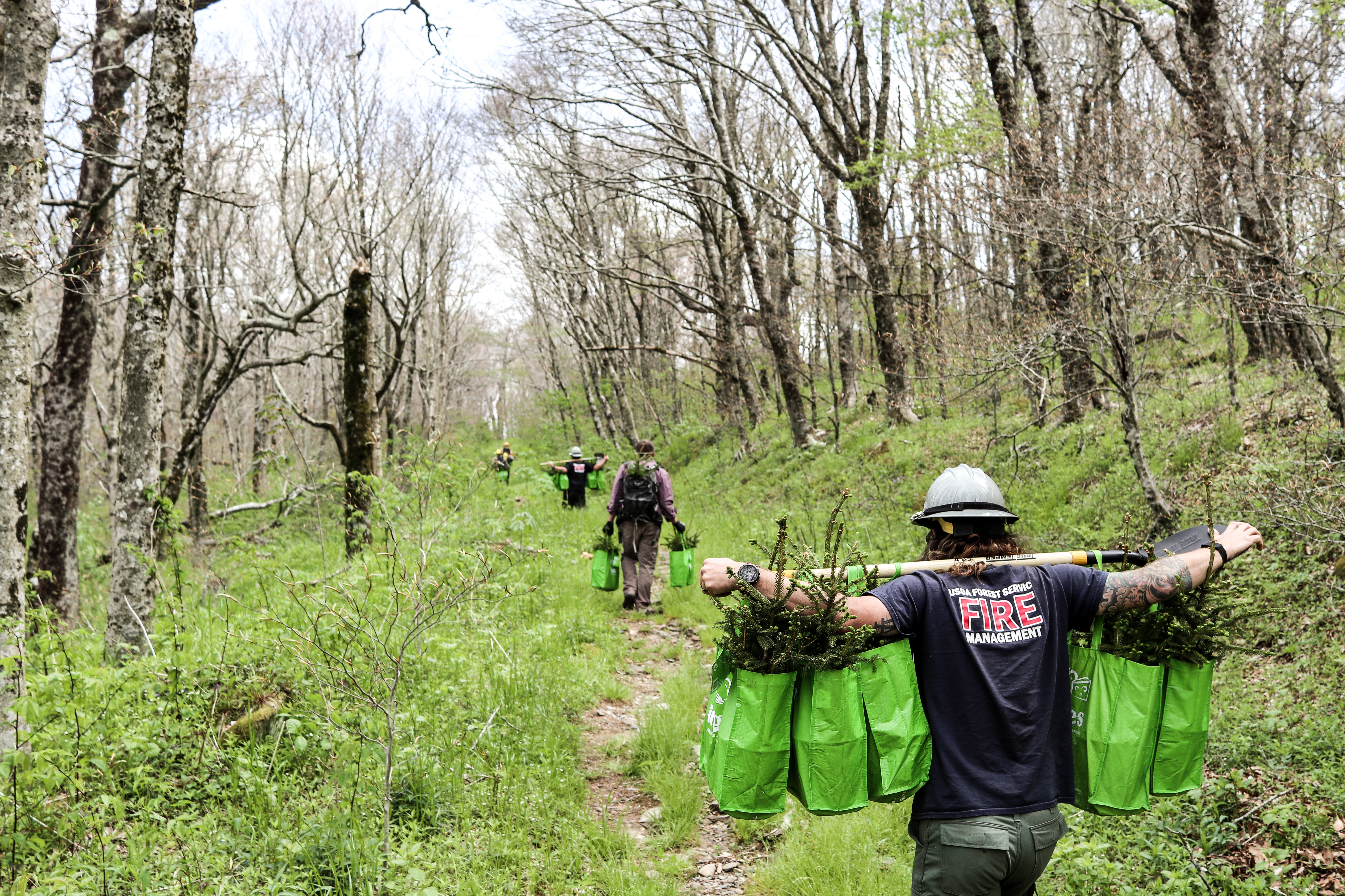 A work crew made up of government agency staff and university volunteers work to move young red spruce trees from the road into the forest where they'll be planted.
