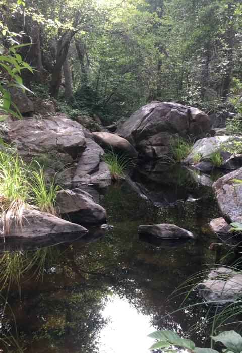The WF San Luis Rey is a high gradient system that flows from high, fishless meadows on Palomar Mountain to low flow, boulder channels further downstream. Palomar Mountain receives more rain than anywhere else in San Diego County, averaging around 24 inches of rain per year. As such, the WF San Luis Rey can have large flows over short durations from rain storms. A natural waterfall separates the upper section from the rest of the WF San Luis Rey, and also blocks Coastal Rainbow Trout passage to the upstream meadows. Below this is a large pool with year-round water nearly 12 feet deep that is the furthest upstream point for Coastal Rainbow Trout. The waterfall stops flowing in early-mid summer, although a small crack supplies water to support perennial pools downstream. The middle section goes mostly dry during late summer, containing both intermittent (hyporheic sections) as well as spaced pools. Pools are bedrock-boulder dominated with large cobbles, sand, undercut banks, and some woody debris that provides cover for aquatic residents.