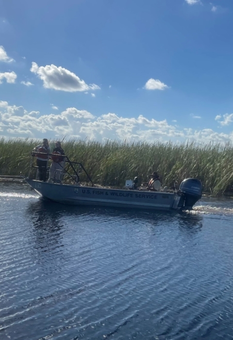 On November 2-3, the Service’s Southeast Region Fisheries and Aquatic Conservation staff from Peninsular Florida Fish and Wildlife Conservation Office (FWCO) and Welaka National Fish Hatchery (NFH), in cooperation with staff and American Conservation Experience interns from the Arthur R. Marshall (A.R.M.) Loxahatchee National Wildlife Refuge (NWR), collected and relocated 60 Florida gar and 15 bowfin from the Loxahatchee NWR to the Old Tamiami Canal on the Miccosukee Tribe of Indians of Florida Reserve Area.