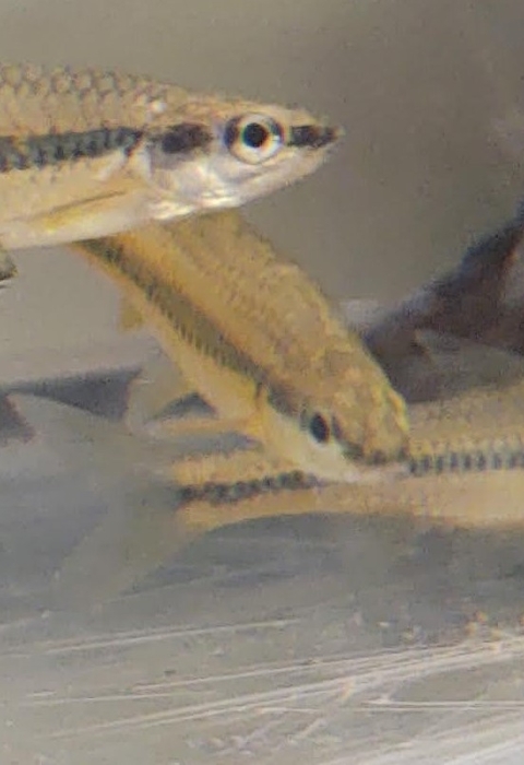 The Cape Fear shiner is a small (about 2 inches long), yellowish minnow with black bands along the sides of its body. The shiner’s fins are yellow and somewhat pointed. It has a black upper lip, and the lower lip bears a thin black bar along its margin. The Cape Fear shiner is known to consume plant and animal material. However, unlike most other minnows in the genus Notropis, the Cape Fear shiner’s digestive tract is modified primarily for a plant diet by having an elongated, convoluted intestine.
