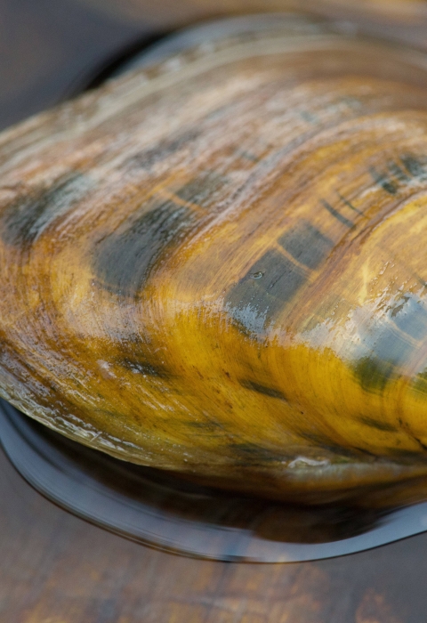 The clubshell is a small to medium size (up to 3 inches long) freshwater mussel that was listed as endangered, without critical habitat, in 1993 (58 FR 5638-5642). Its shell exterior is yellow to brown with bright green blotchy rays and shell interior is typically white. The shell is wedge shaped and solid, with a pointed and fairly high umbo.