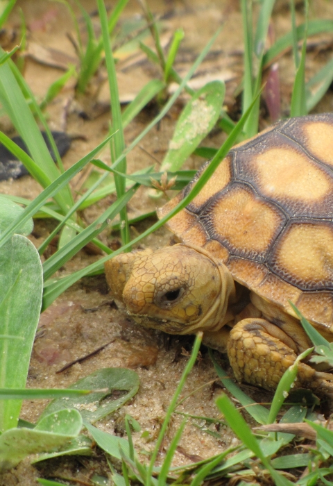 The gopher tortoise is a large, (shell 15 to 37 centimeters or 5.9 to 14.6 inches long) dark-brown to grayish-black terrestrial turtle with elephantine hind feet, shovel-like forefeet, and a gular projection beneath the head on the yellowish, hingeless plastron or undershell (Ernst and Barbour 1972). The sex of individual turtles can usually be determined by shell dimensions. A male turtle has a greater degree of lower shell concavity, and a longer gular projection. However, the sex of tortoises at maturity size is difficult to determine (U.S. Fish and Wildlife Service 199O).