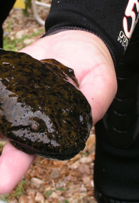 The Ozark hellbender is a large, aquatic salamander that occurs in cool, clear Ozark streams in southern Missouri and northern Arkansas. Cool and clear water is important because hellbenders breathe entirely through their skin, which contains numerous folds to increase oxygen absorption. Adult Ozark hellbenders spend most of their life under large, flat rocks that shelter them; whereas larval and juvenile hellbenders hide beneath large rocks and under small stones in gravel beds. Ozark hellbenders are one of two subspecies of hellbenders, with the eastern hellbender being the other subspecies.