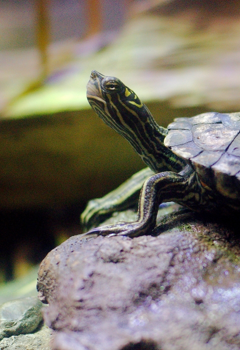 The ringed sawback turtle is small. Each shield of its upper shell (carapace) has a yellow ring bordered inside and outside with dark olive-brown: its undershell (plastron) is yellow. The head has a large yellow spot behind the eye, two yellow stripes from the orbit backwards, and a characteristic yellow stripe covering the whole lower jaw (Cagle 1953). Males grow to 1O centimeters (cm) and females to 18 cm in plastron length.