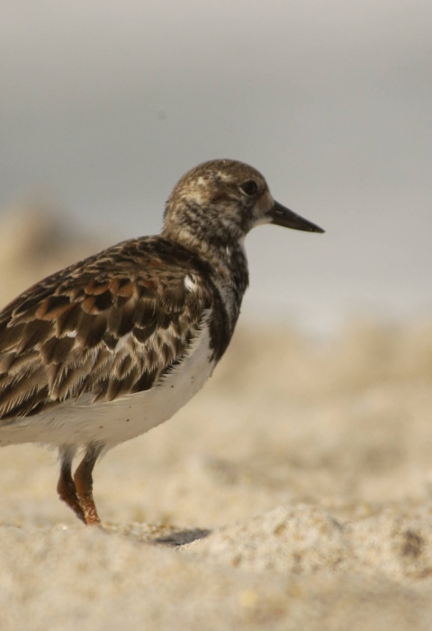 Ruddy turnstones are small, stout shorebirds with distinctive black and chestnut breeding plumage. Found throughout the world, they breed in the high arctic tundra and winter along the Atlantic coast of Europe through northwestern Africa, and both coasts of North and Central America. On the Eastern Seaboard of North America, they winter as far north as Massachusetts, but occasionally into Nova Scotia. Ruddy turnstones use their slender bills to overturn rocks and seaweed, searching for insects, plant material, crustaceans, and horseshoe crab eggs. The species is generally seen in the company of other shorebirds on the beach during the spring and fall migrations.