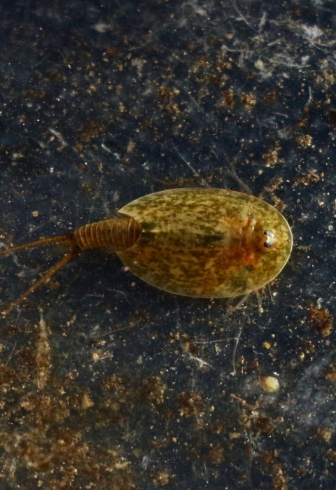 The vernal pool tadpole shrimp is a small, freshwater crustacean that is found in vernal pools in California. They have a hard shell that is large, flattened and arched like a shield over its back. This structure structure
