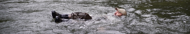 Kris isn’t wearing a personal flotation device, but is able to trap air in his waders and make his way towards the shallow inner bend by using his hands and ruddering his feet in the opposite direction he wants to go. Photo: USFWS/Katrina Liebich