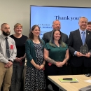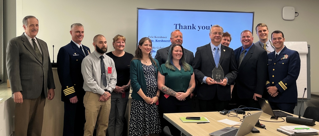 From left to right: Stephen Guertin, USFWS; Capt. Jonathan Theel, Sector Delaware Bay; Dan Muse, Tri-State Bird Rescue Operations Coordinator; Lisa Smith, Tri-State Bird Rescue Executive Director; Jessica Slutter, Tri-State Bird Rescue Oil Programs Manage; Bob Poole, Delaware Bay & River Cooperative President; Katlyn Muse, Tri-State Bird Rescue Operations Coordinator; Jerry Conrad, Sector Delware Bay Contingency Planner; Debra Scholz, Scholz & Associates Proprietor; Todd Wardwell, Sector Delaware Bay Port Recovery Specialist; John Nelson, Department of the Interior Philadelphia Region Environmental Officer; LCDR Andrew Kennedy, Sector Delaware Bay- Chief, Emergency Management & Force Readiness) 2022 Awardees standing together for a photo with their award at the Council meeting by USFWS
