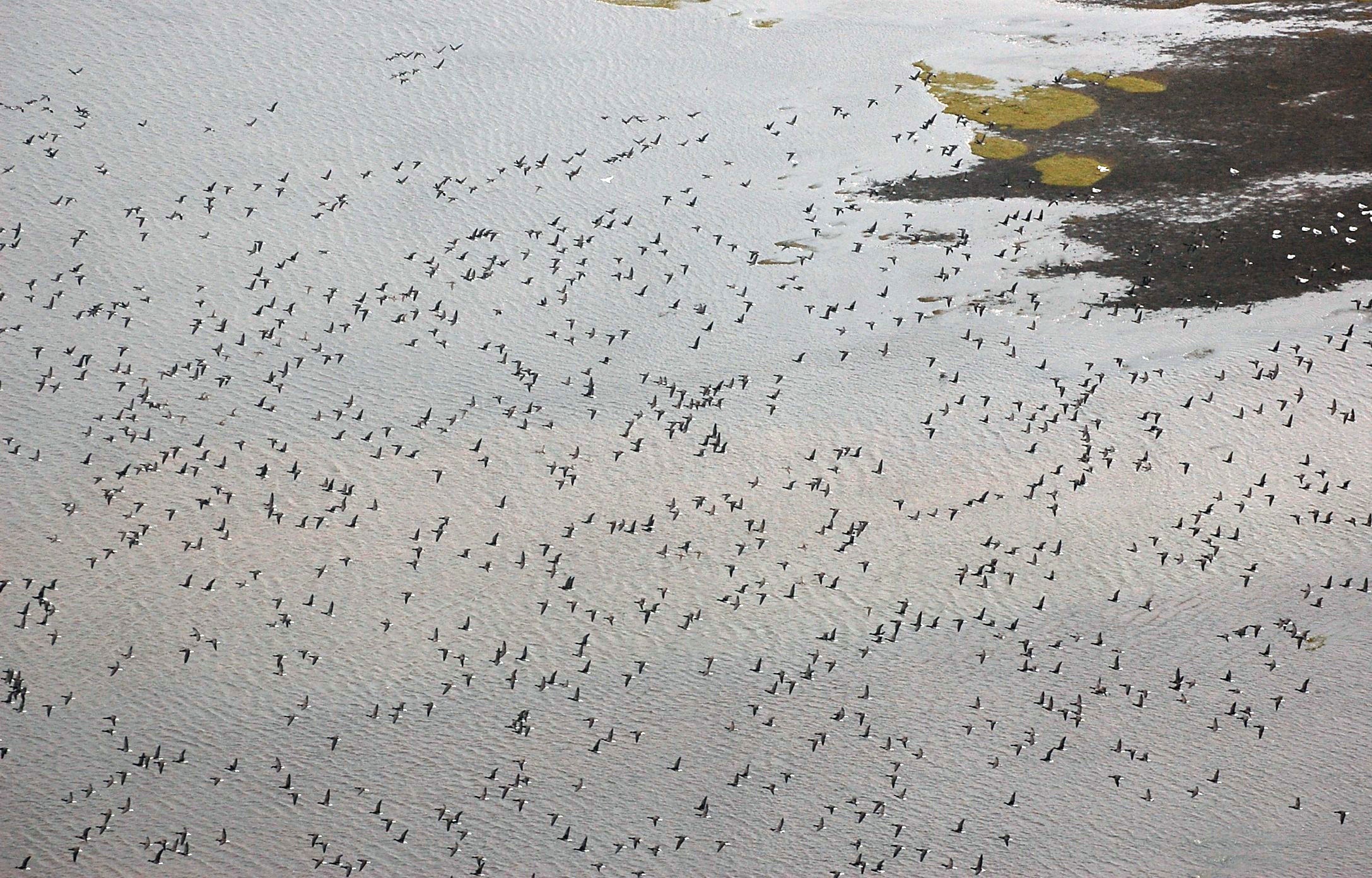 Aerial view of black brant in flight over Izembek National Wildlife Refuge.