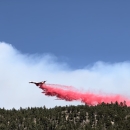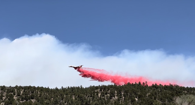 An air tanker drops fire retardant on Calf Canyon and Hermits Peak fires within Santa Fe National Forest.