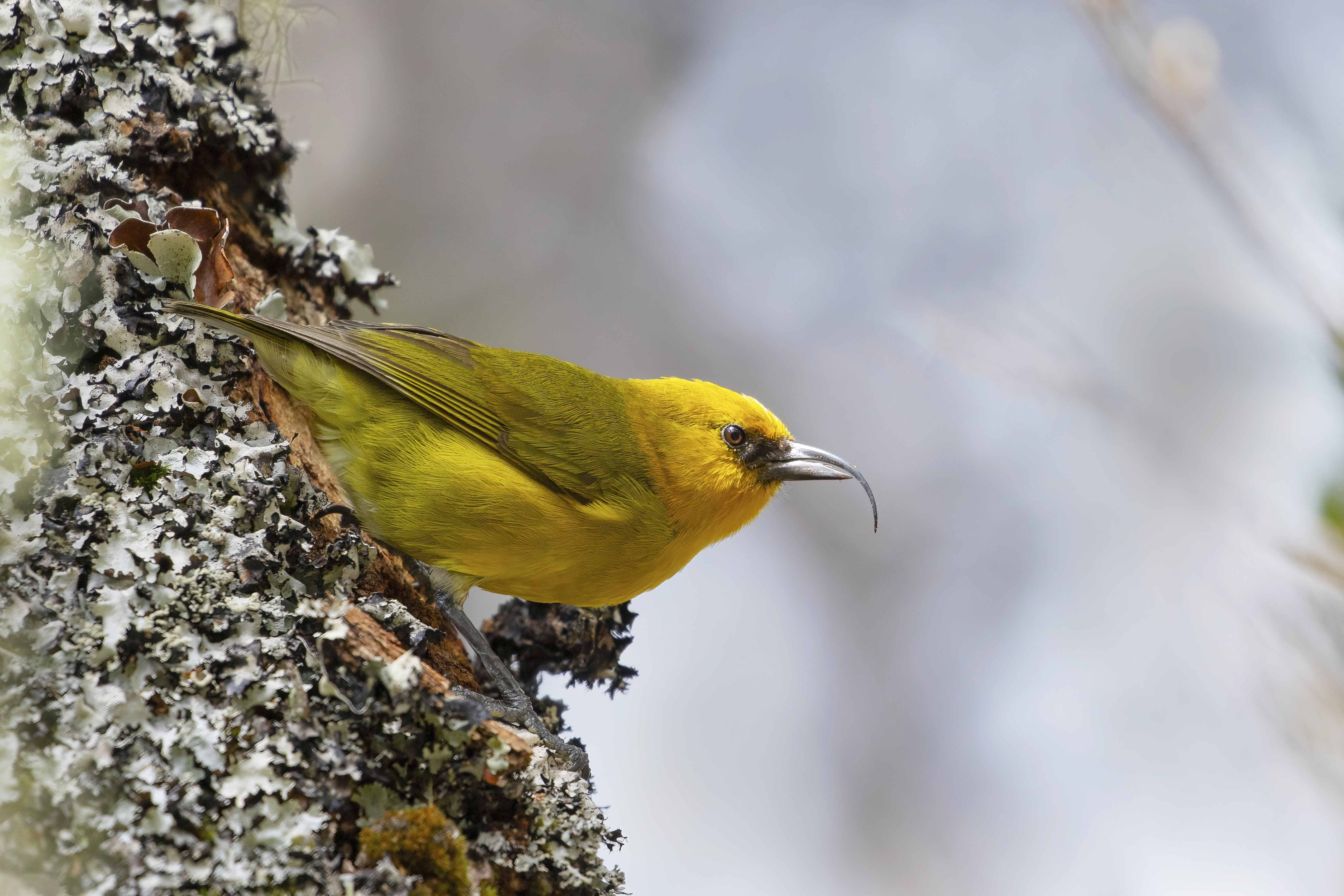 The ‘akiapōlā‘au is a stocky Hawaiian honeycreeper endemic to the island of Hawai‘i and most famous for their specialized bills, which have a long, decurved upper mandible and a short woodpecker-like lower mandible.