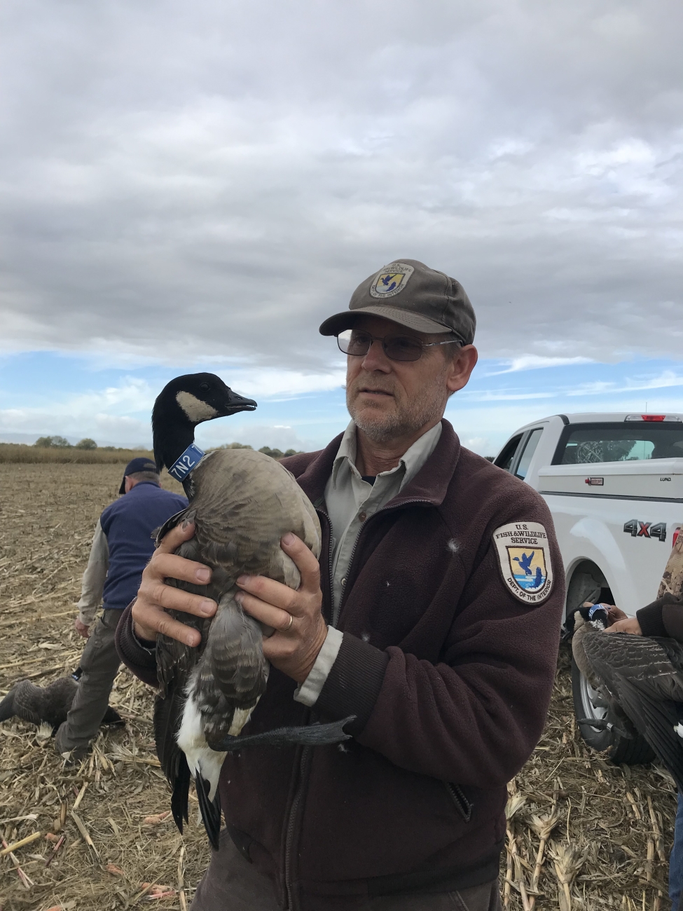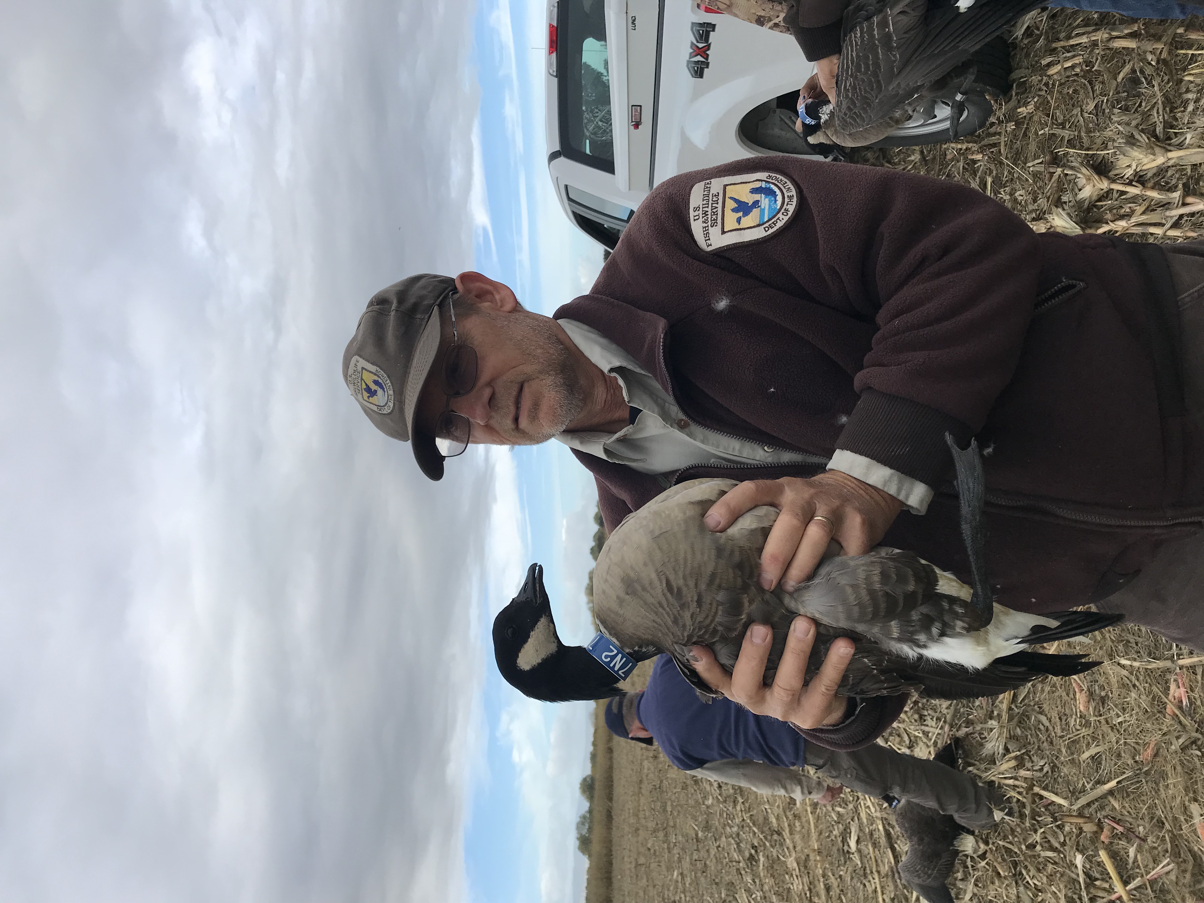 A staff member at the San Joaquin River wildlife refuge in California holds a collared and banded Aleutian cackling goose before releasing it to return to its flock.