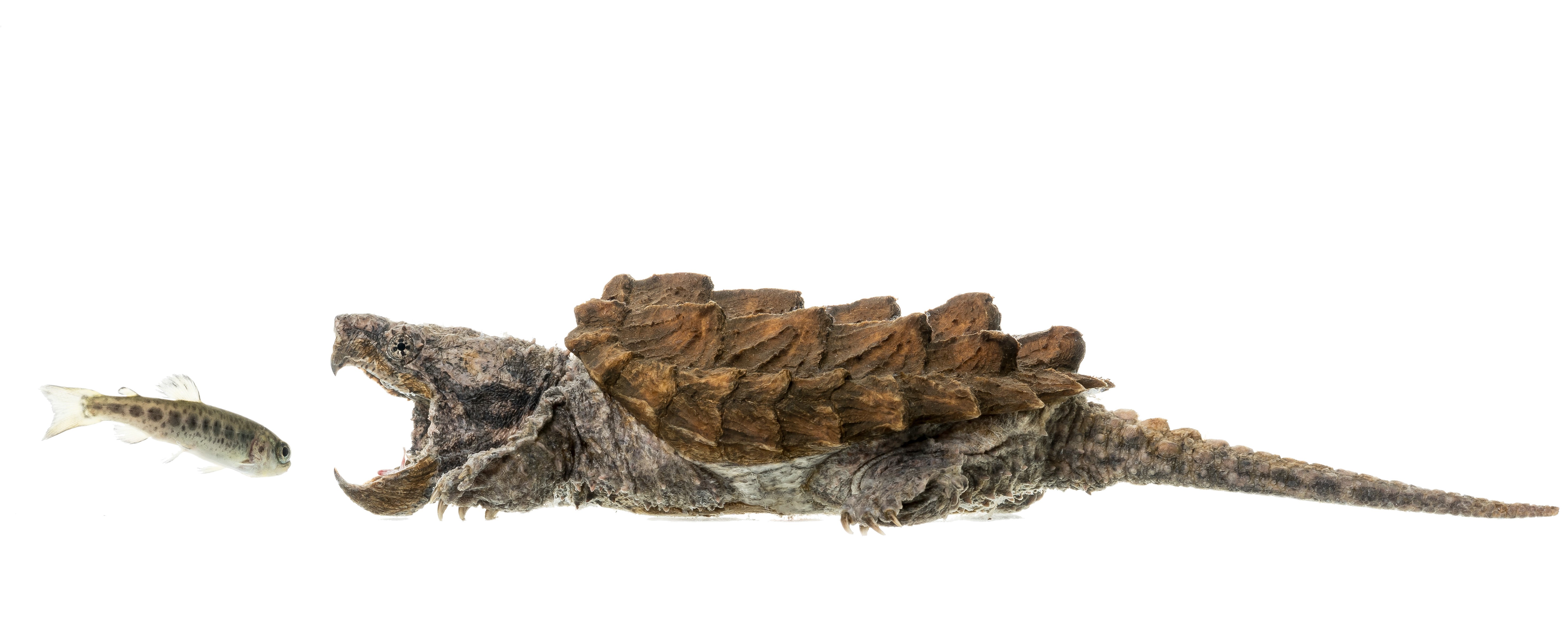 An alligator snapping turtle (Macrochelys temminckii) preparing to eat a trout. Photographed at Gavins Point National Fish Hatchery in Yankton, South Dakota.
