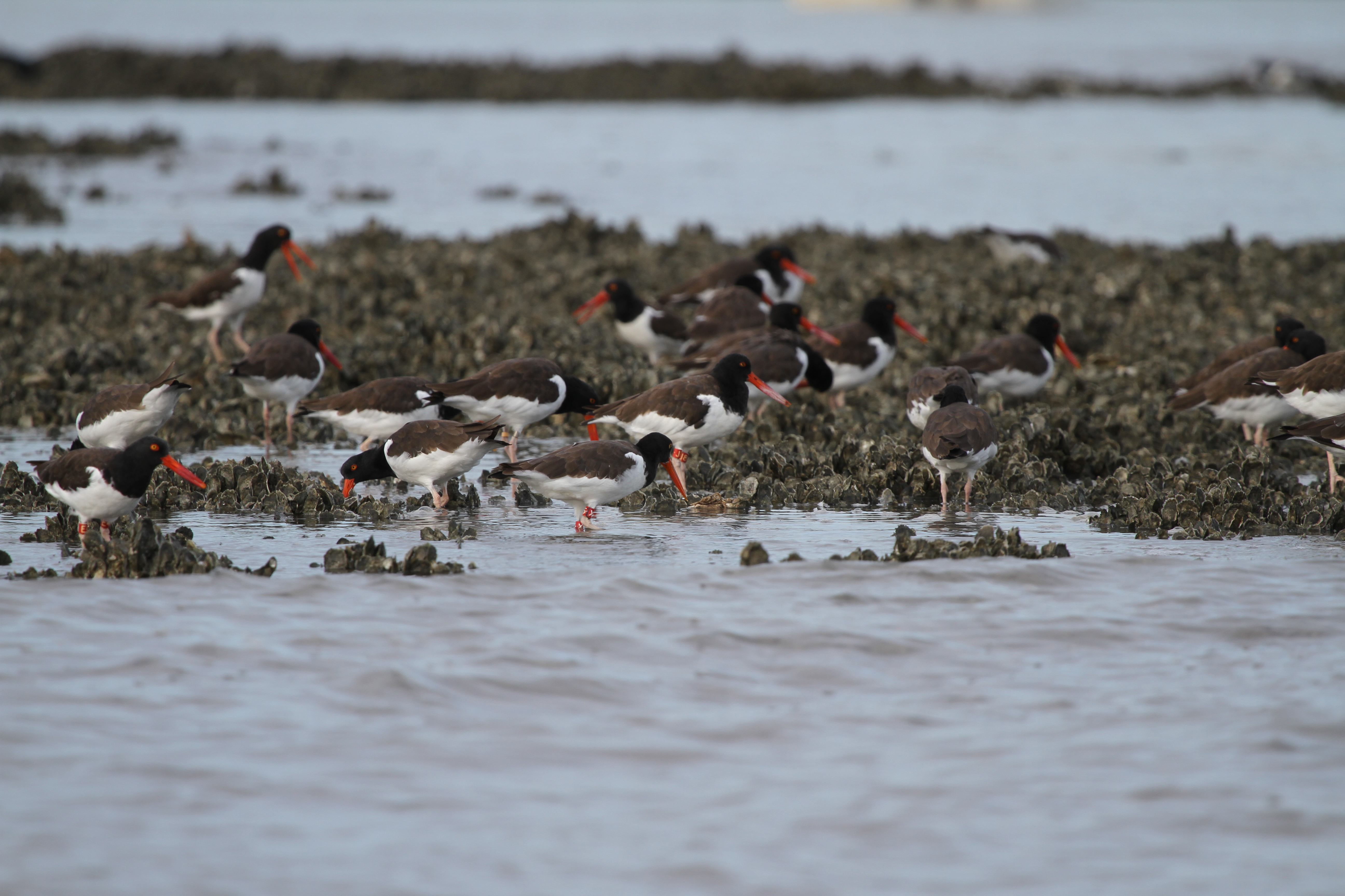 American oystercatchers feeding in oysterbeds around Wolf Island NWR.