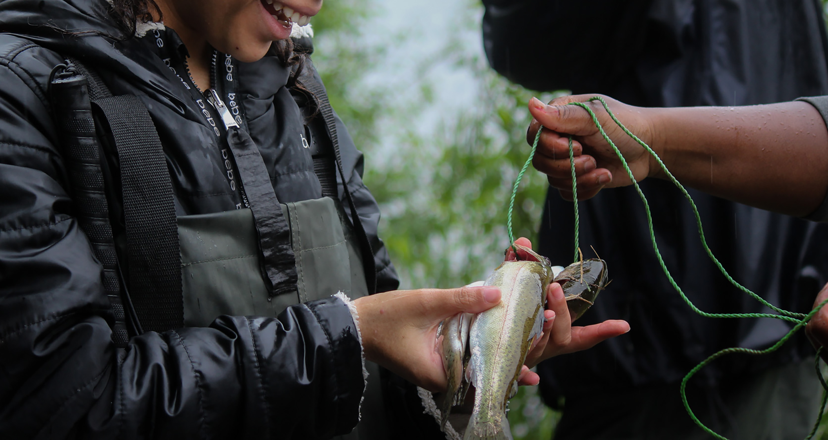 A participant holds a stringer of Rainbow Trout in Anchorage, Alaska