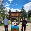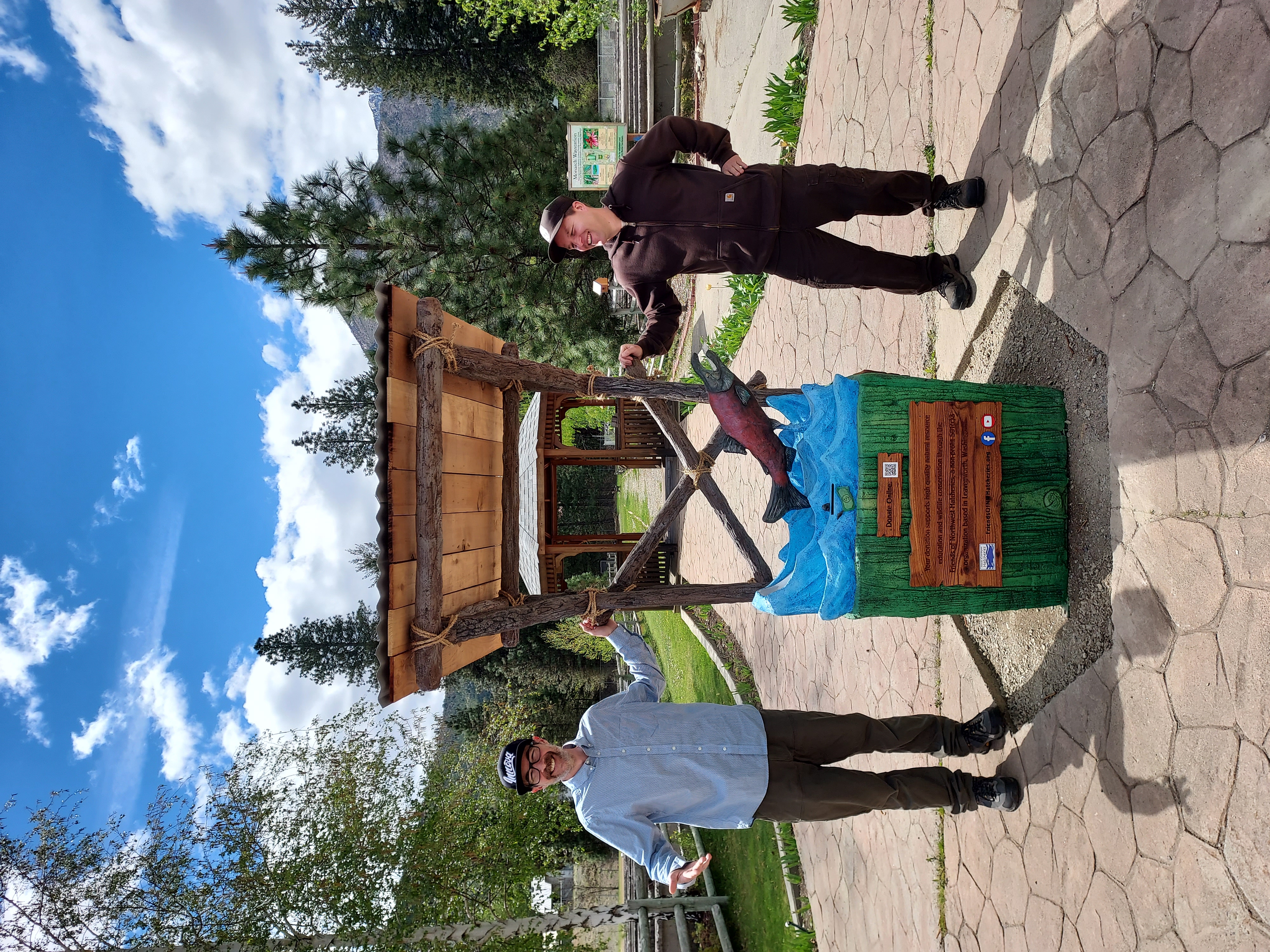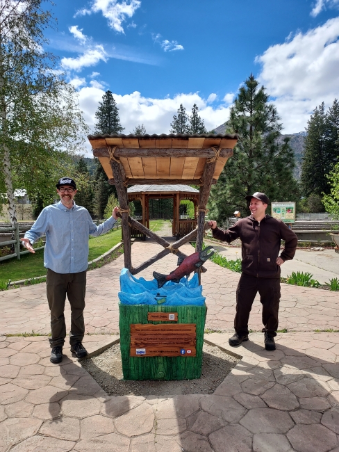 Andy Jaynes, President of Friends of Northwest Hatcheries, and Mat Maxey, Manager of Leavenworth National Fish Hatchery, pose beside the newly-installed "giving tower," a model of a tribal fishing platform with a leaping salmon below it. This new donation box/artwork will raise funds for FNH.
