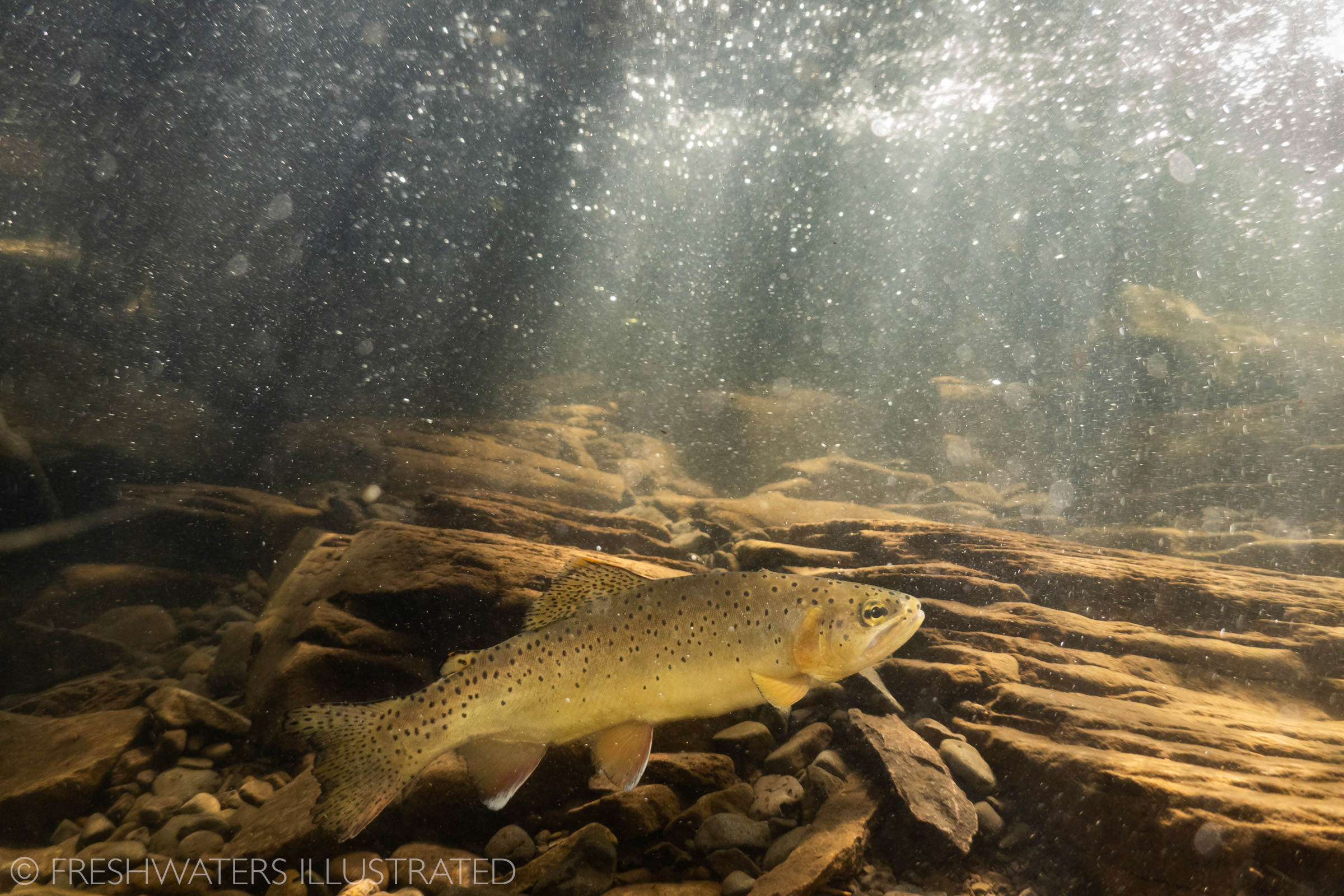 A close-up underwater shot of an Apache trout swimming