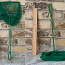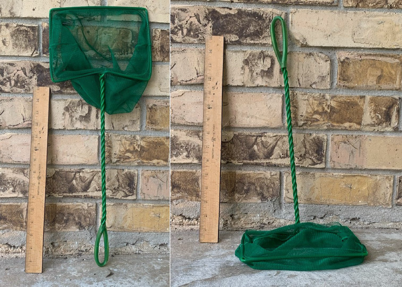 Figure 2. Aquarium nets are smaller than landing nets and may be helpful for hand or hand net captures so long as they have mesh consistent with that described in the bottle line method. Upper left: An aquarium net next to a 15-inch ruler. Upper right: An aquarium net with handle bent for careful capture of black rails. Image: USFWS, J. Wilson