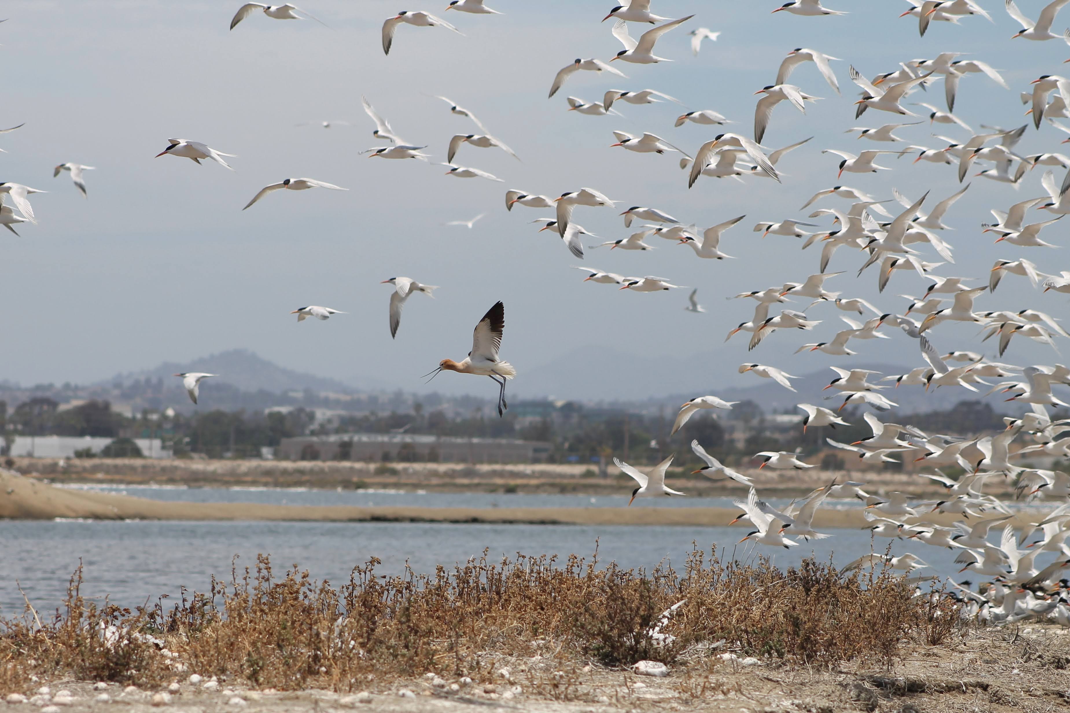 At South San Diego Bay Unit, an avocet takes flight while surrounded by terns.